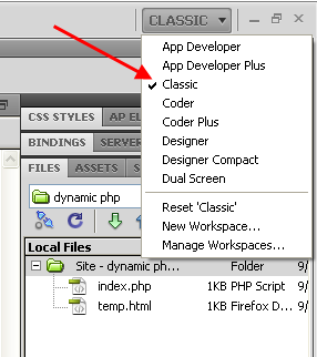 As I mentioned early the insert toolbar that appeared at the top of the editing window in previous versions of Dreamweaver, has now been docked as a panel. The easiest way to get to it is to select the 'Classic' option from the workspace drop-down-list:
